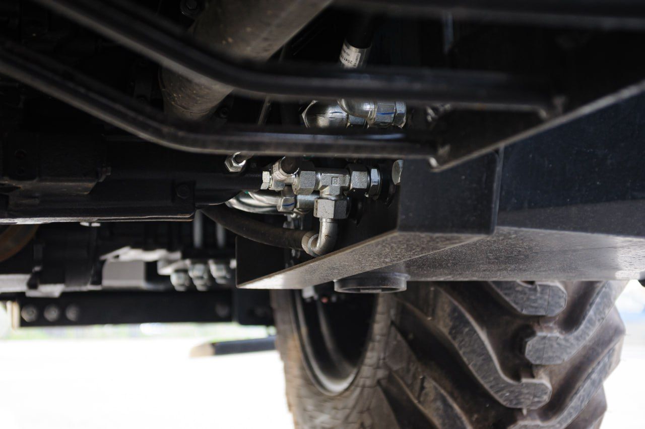 За счёт управляемых мостов (система 4WS) машина имеет функции "Крабового хода" и "След в след". Мокрые дисковые тормоза на обеих осях.